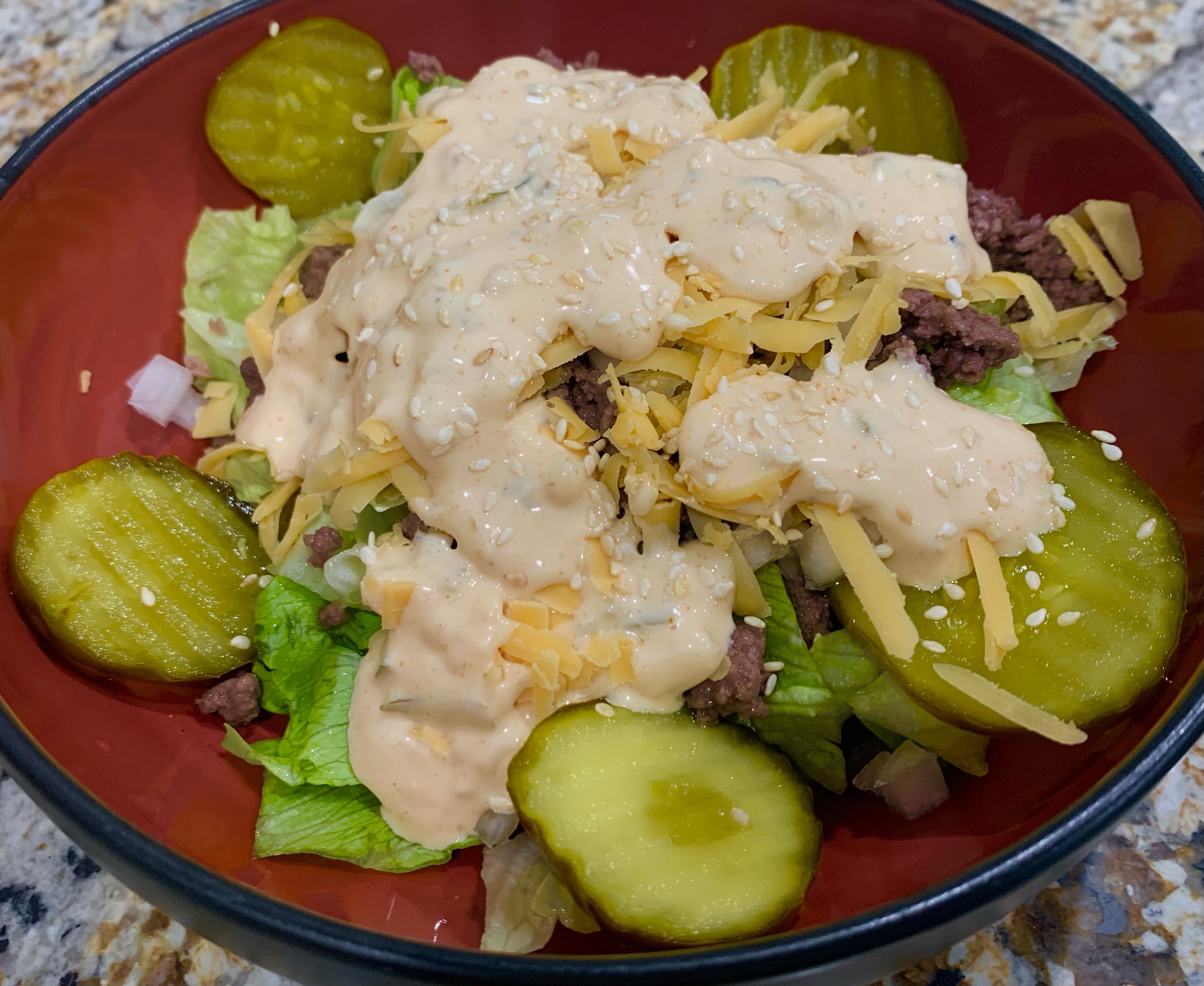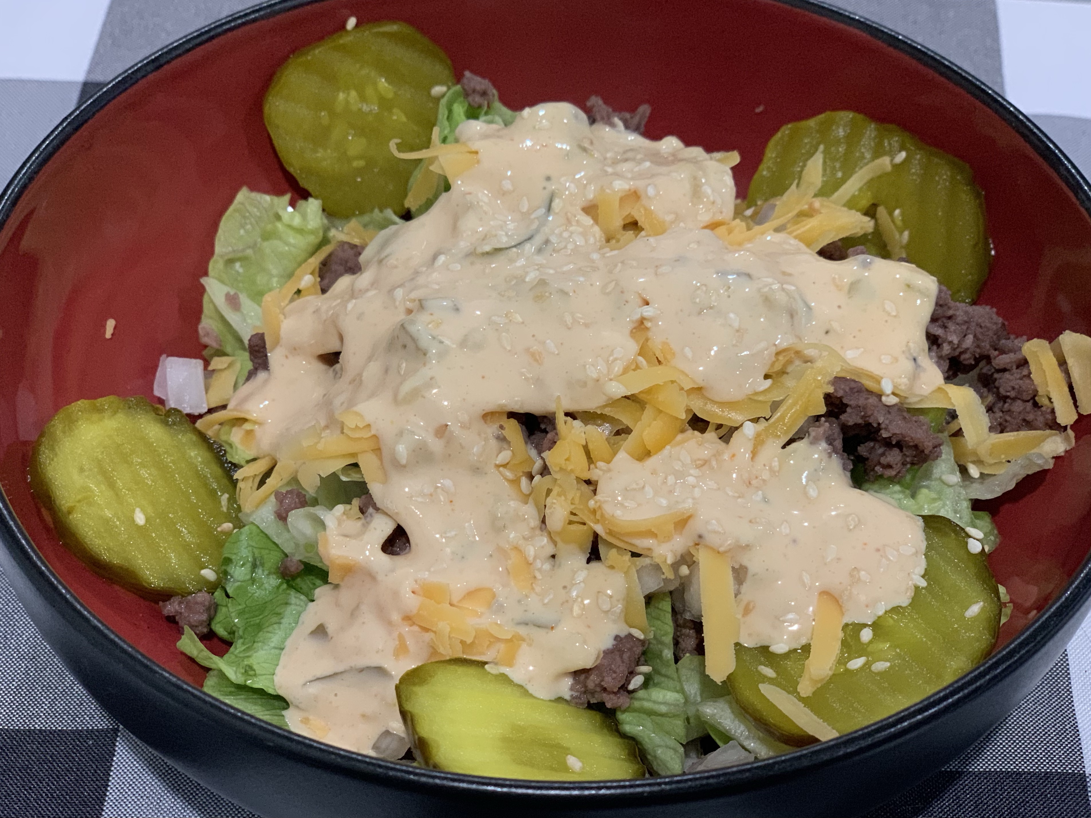 Spoon drizzle the Big Mac sauce over the salad or serve the dressing on the side. Top with sesame seeds. Enjoy!