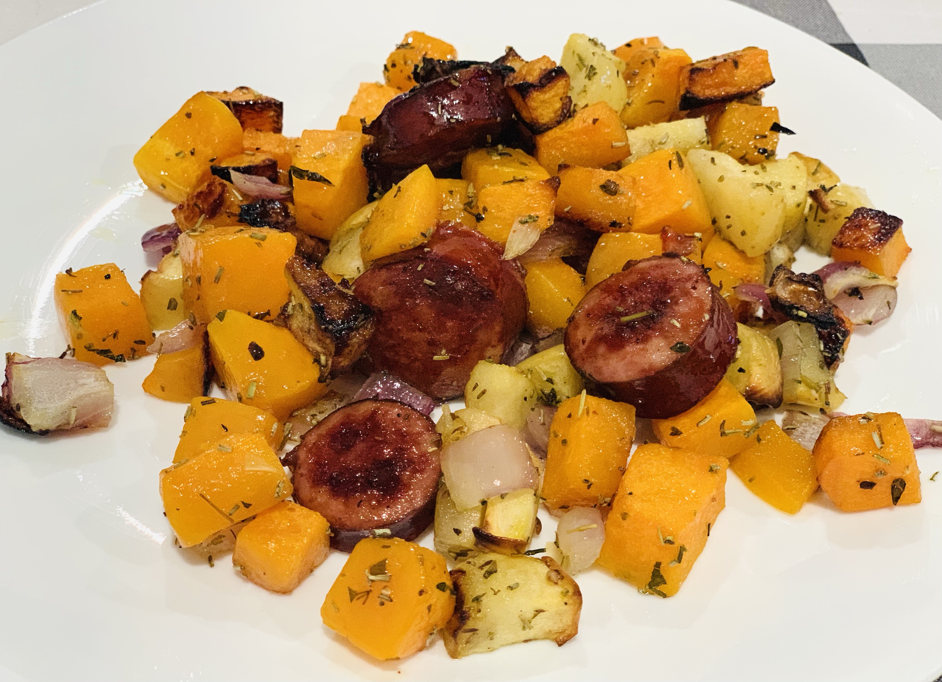 One Pan Sausage with Butternut Squash and Apples. This delicious healthy dish is a breeze to put together and even easier for clean up. Prep to Table in about an hour so it’s also a perfect week day meal.