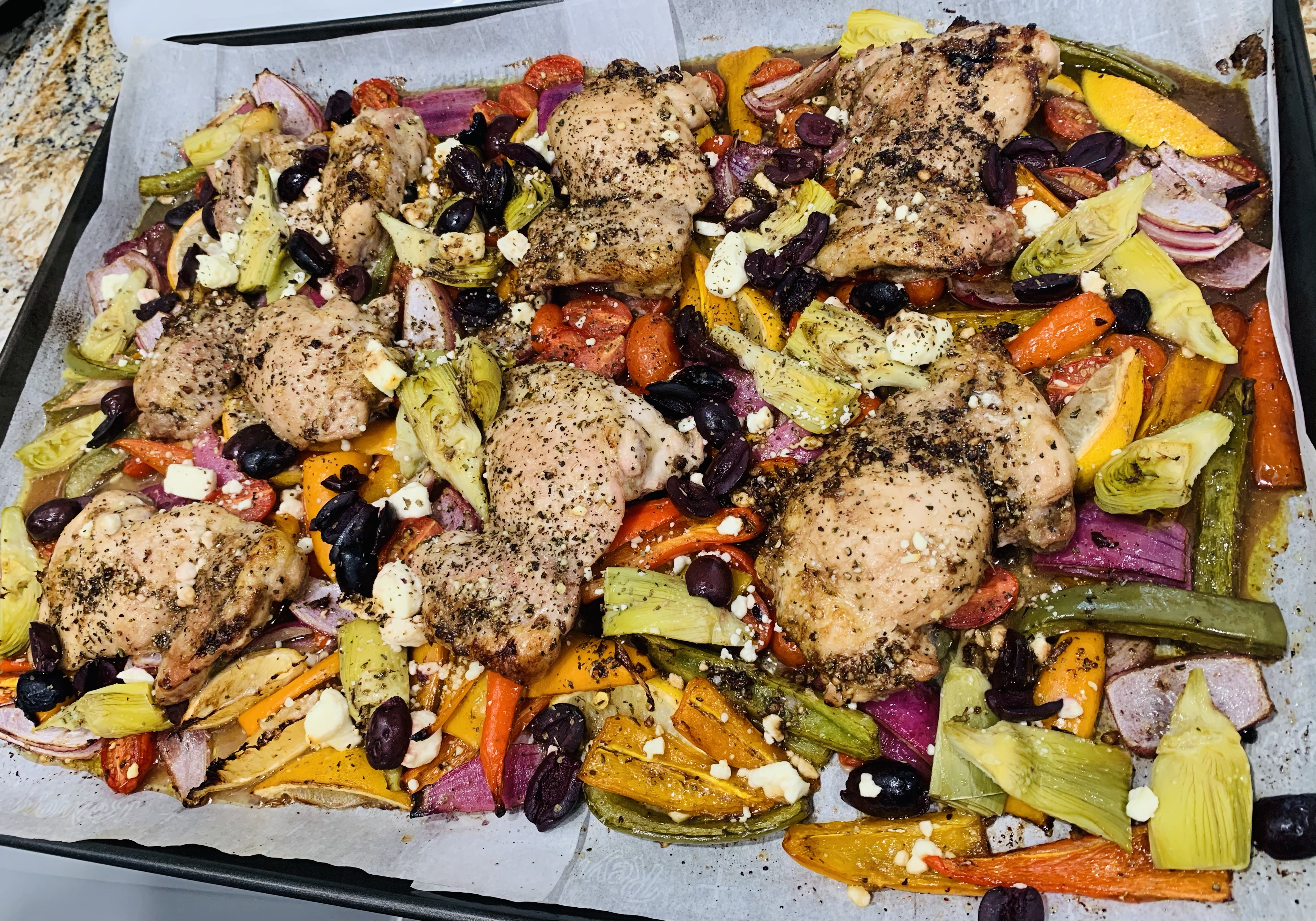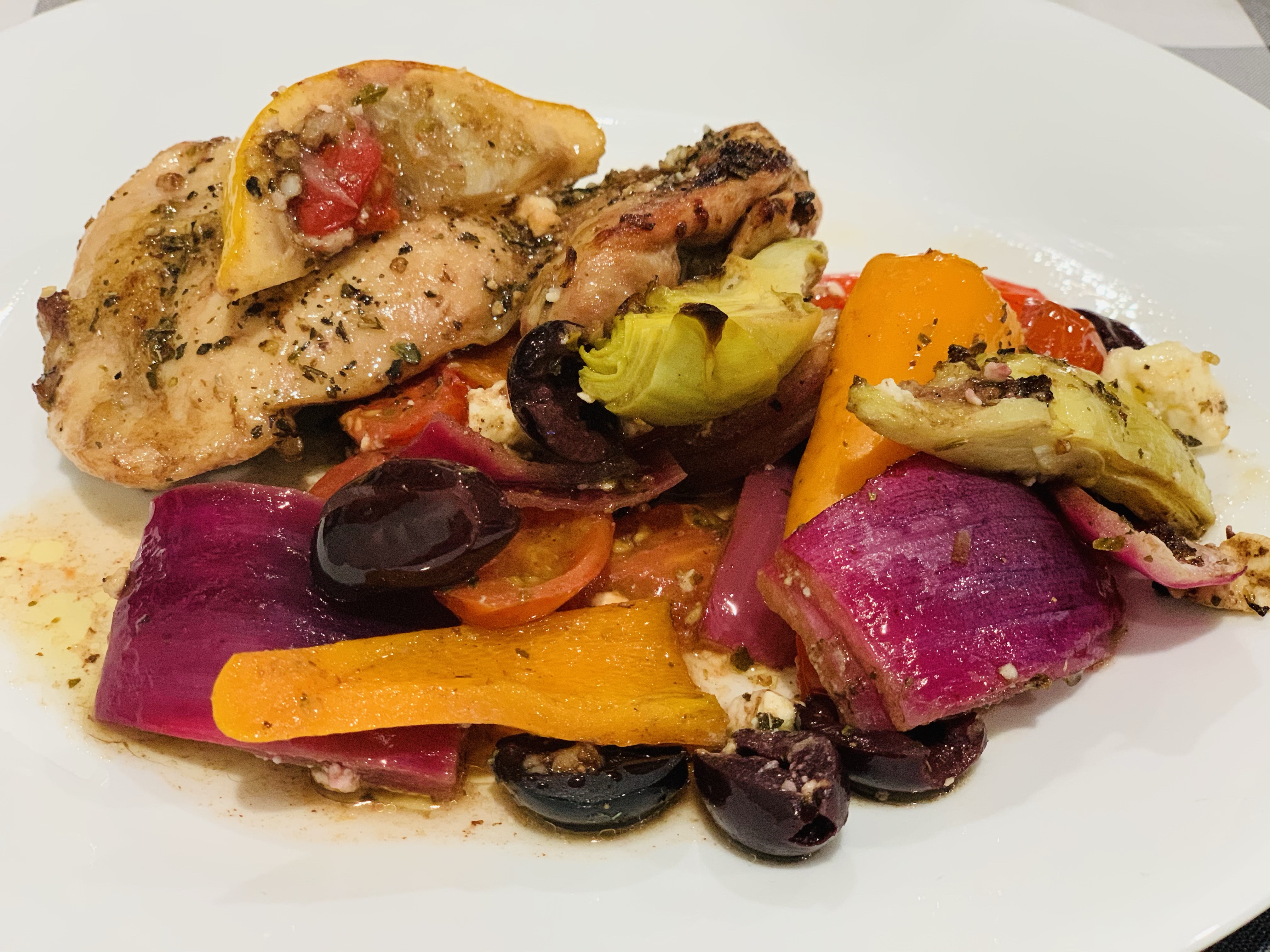 One Pan Greek Chicken Bake. This is a real winner for anyone who wants a time saver meal that taste amazing. I love Greek and Mediterranean food and flavors and this really hits that craving spot! You can serve this with Greek Lemon Rice or Roasted Greek Potatoes.
