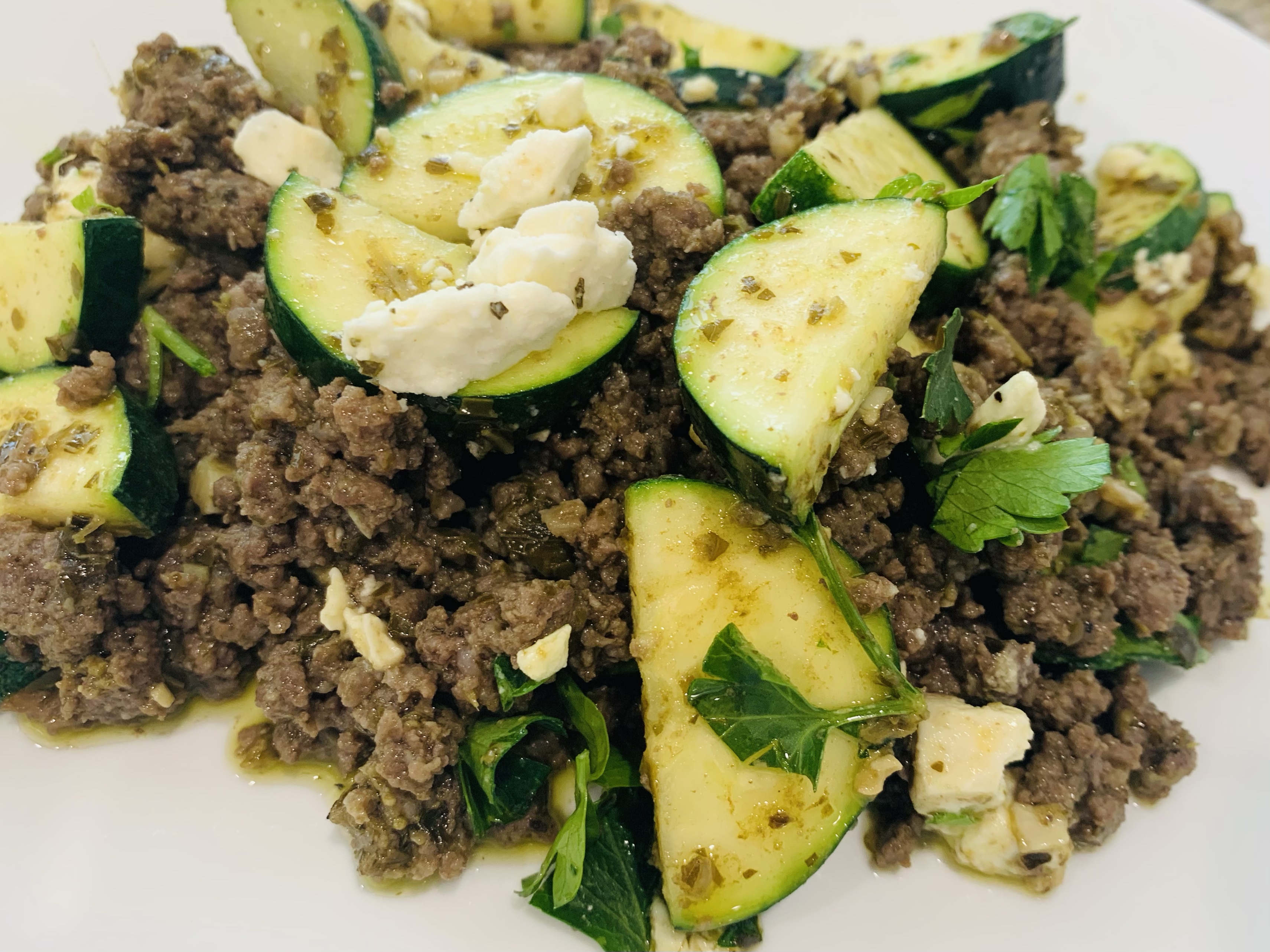 Pesto Beef & Zucchini. It was a new way to enjoy ground beef & zucchini, and didn’t miss the pasta at all. Lots of flavor and very easy to put together quick as we are short on time with school, work and sports.