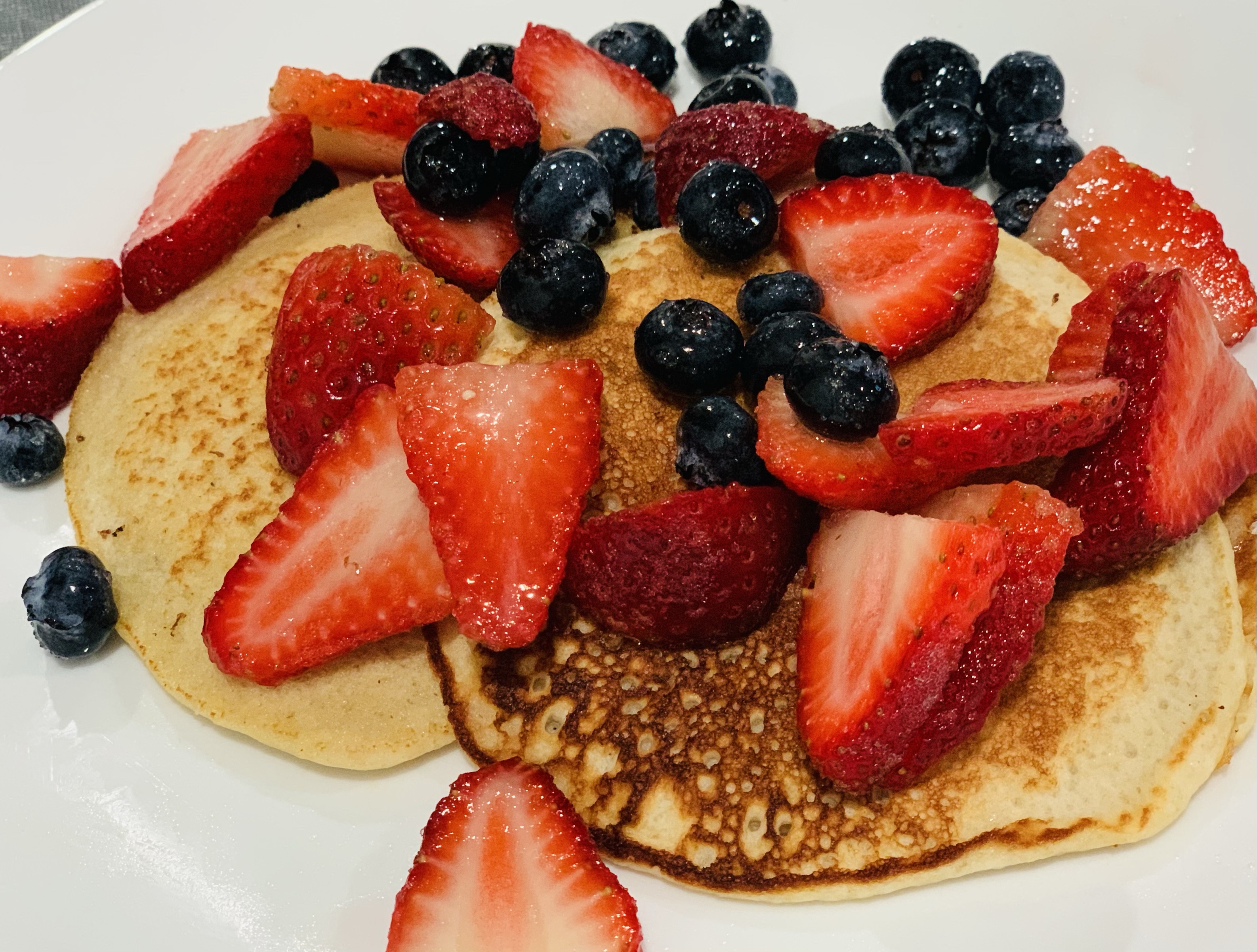 Banana Oat Protein Pancakes with Berries. My goal for these pancakes was to minimize the sugar and carbs while making something tasty that my family will actually eat. These do come out thinner than traditional pancakes, but they taste legit & super yummy. The kids actually ate them as they were coming out of the pan. I had to stop them so we could have some for breakfast lol.