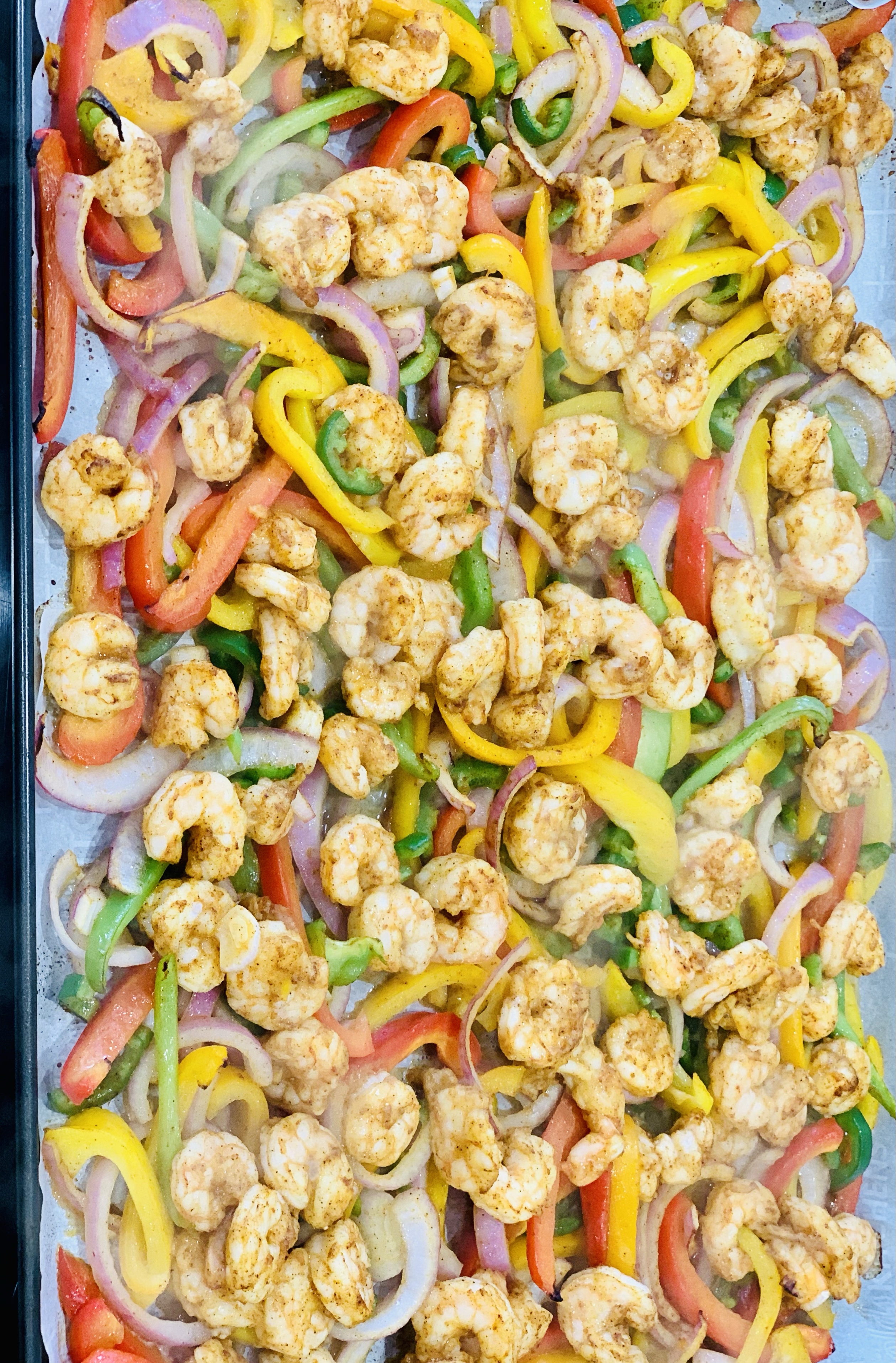Put shrimp, peppers and onions on sheet pan spreading out as a single layer