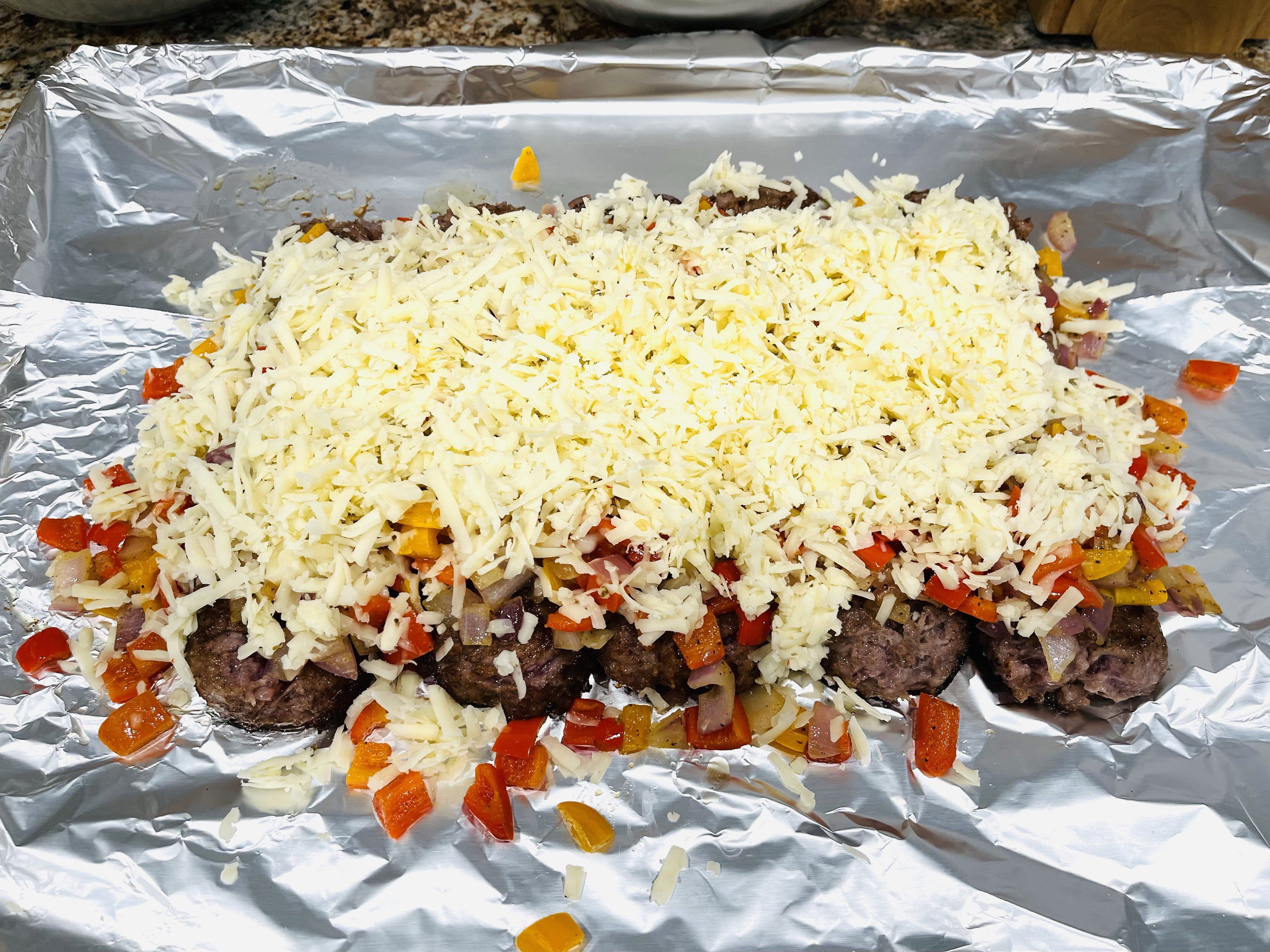 Cover the brats, peppers and onions with cheese. I don’t actually measure my cheese, I just top it until I feel it’s got enough to make the sausages covered well with gooey cheesy goodness! Place in the oven on middle rack and cook for 15 mins (until brats are fully cooked).