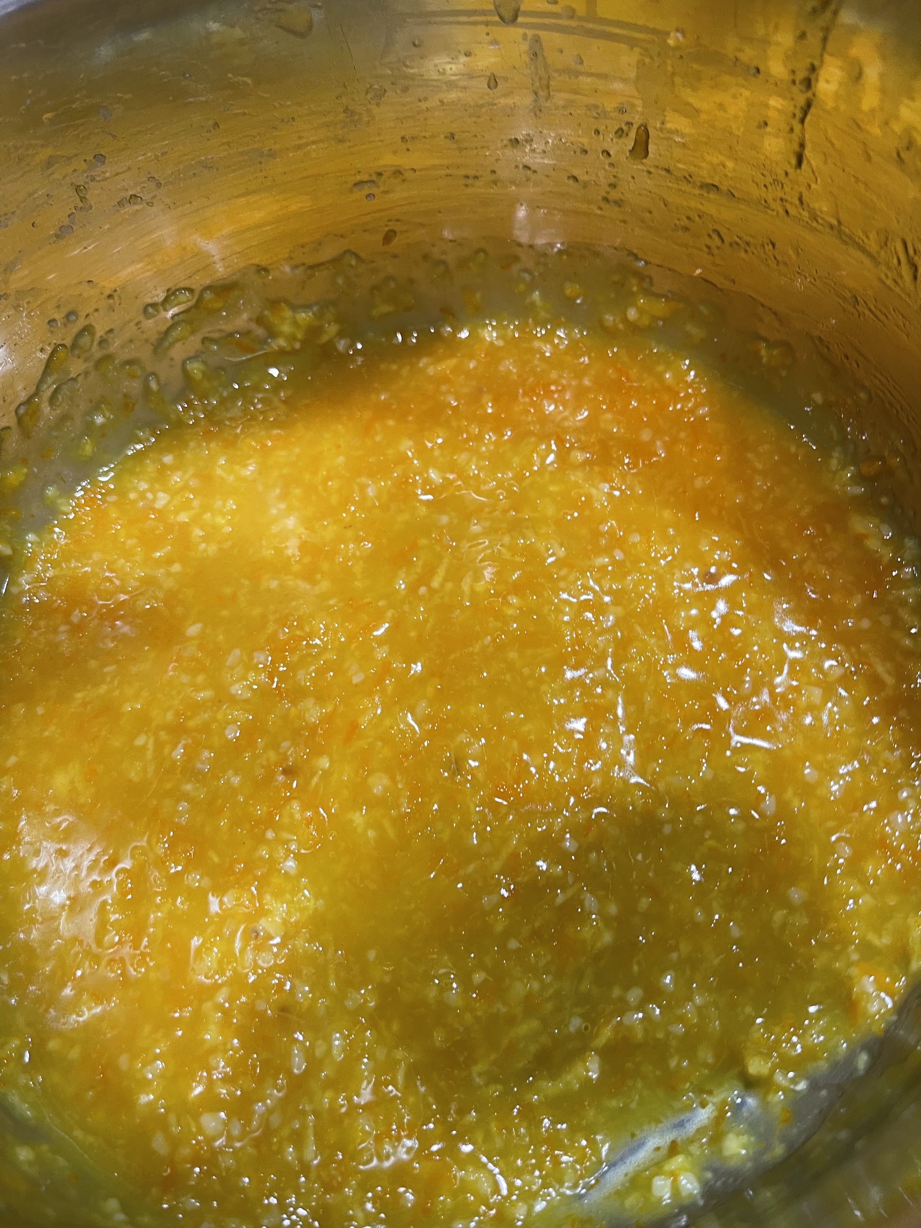 Once the sweetener has dissolved, lower the heat to medium and add in the orange zest mix, then squeeze half the orange juice into the sauce pot as well. Stir well and let it come to a simmer, let it simmer while you finish cooking the chicken. Stir it occasionally. Once it is thick and glaze-like remove it from the heat.