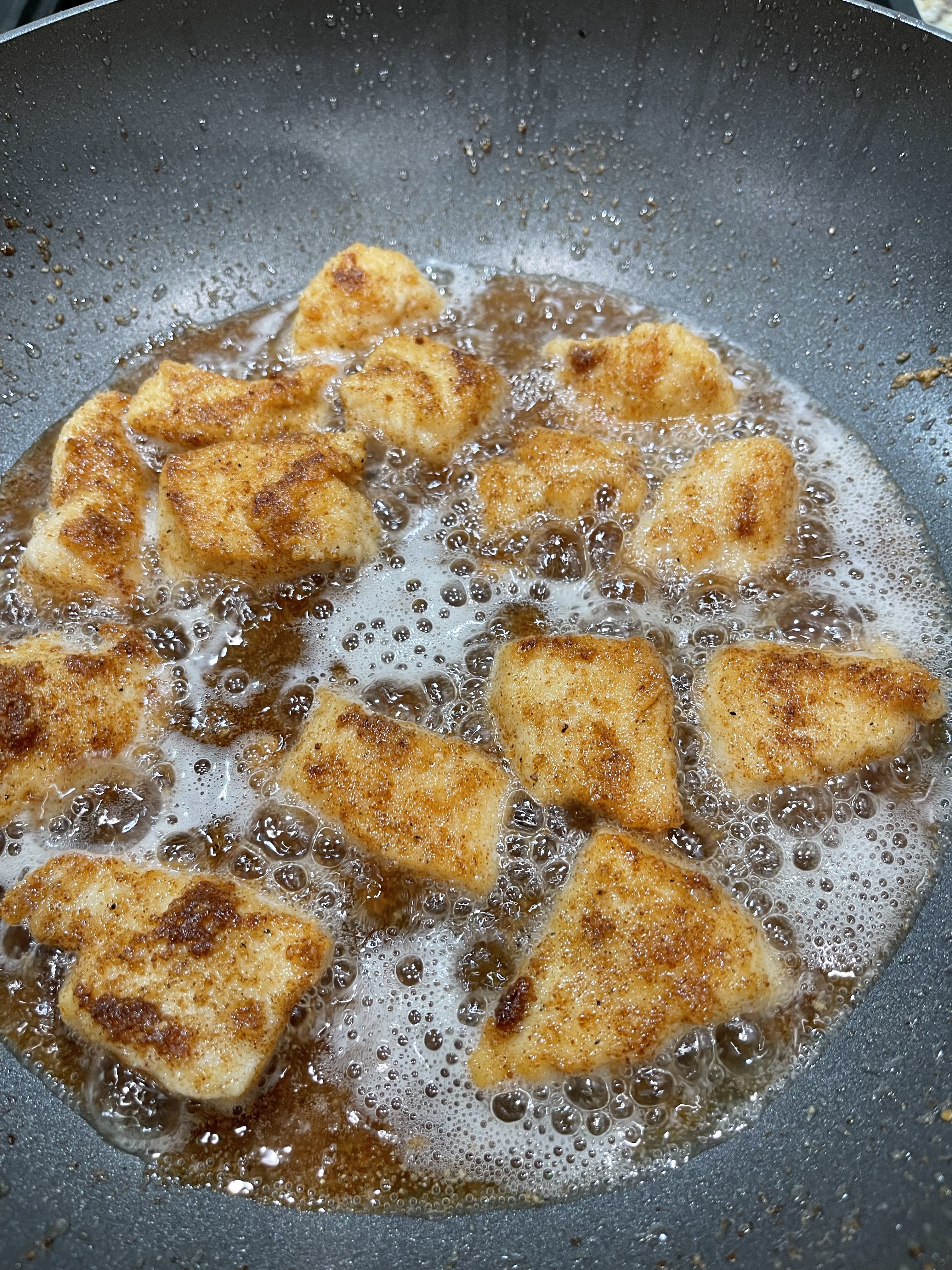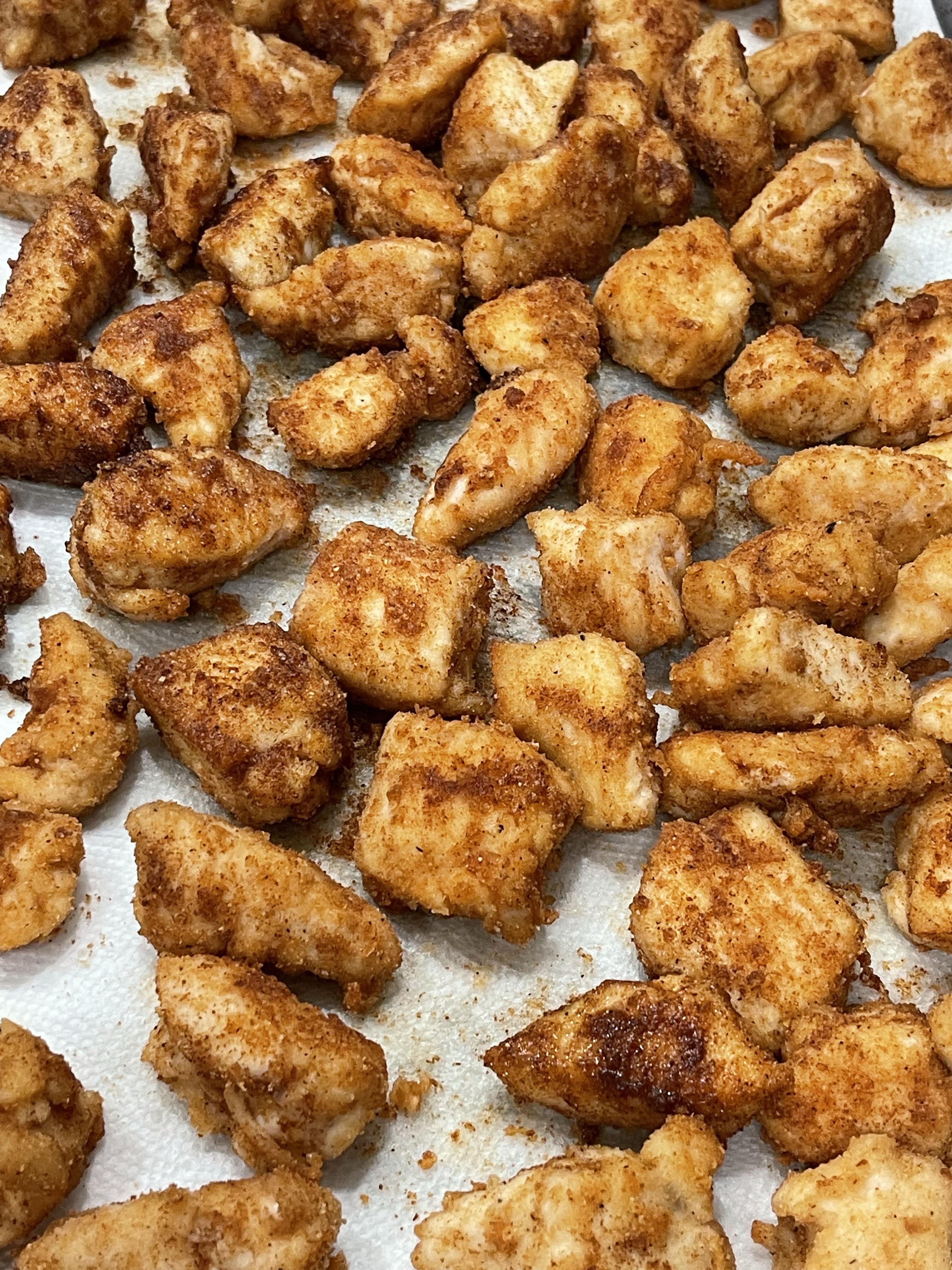 Add oil for frying into the large skillet, about 2 tablespoons. Toss a handful of chicken cubes in the pork rind mix, shake off excess and add then into the skillet. Make sure the pieces aren’t crowding the skillet, you will have to cook them in batches. Cook for 2-3 minutes or until browned then use tongs to turn them over and cook another 3 minutes, until amber brown.