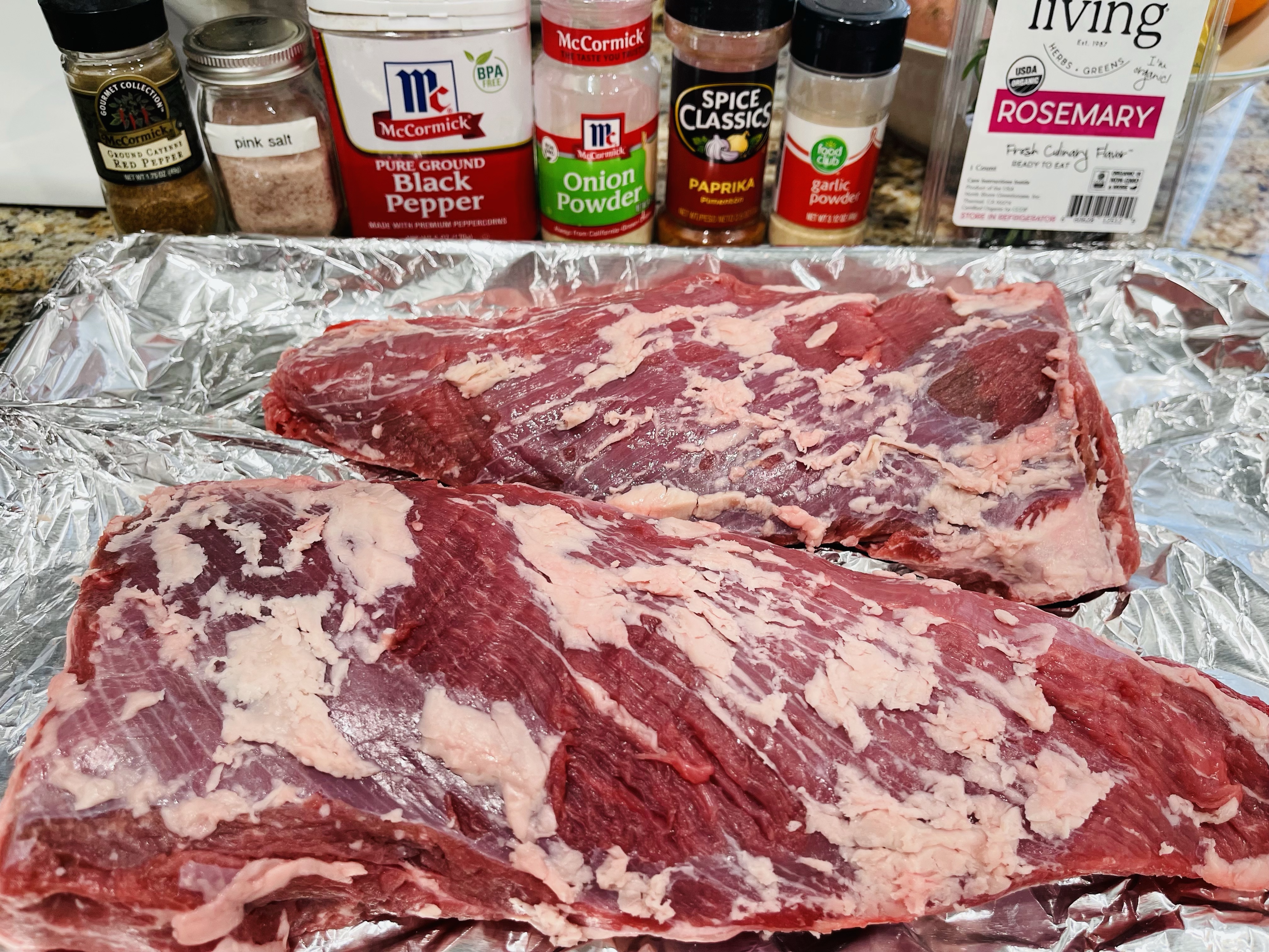 Make sure that your tri tip is trim of most excess fat and dry. Place on a tray, then generously rub both sides of the tri tip first with the fresh rosemary, then with the Santa Maria seasonings. Cover with plastic wrap and place back in the refrigerator for at least 2-24 hours.