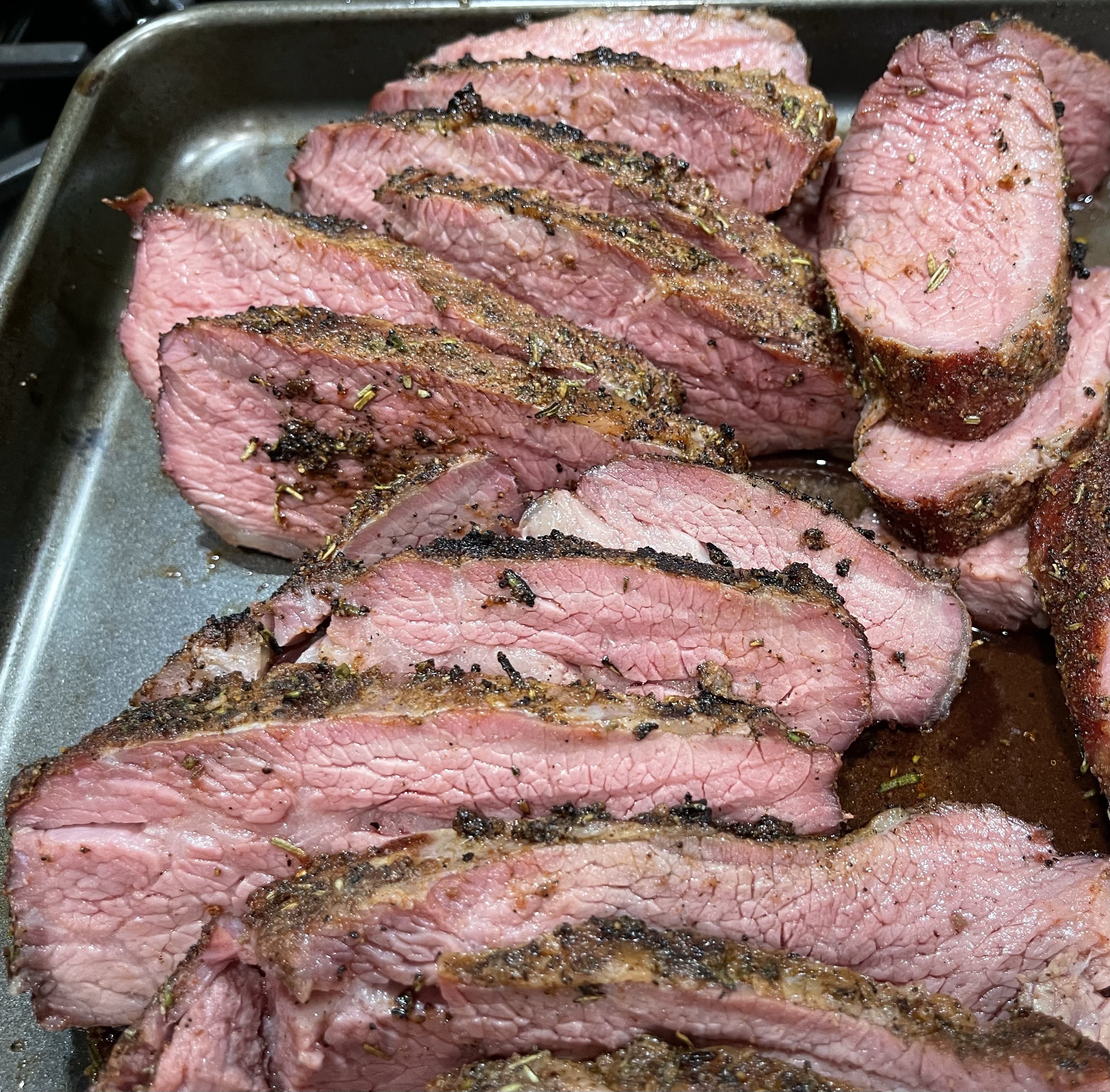 Once done place on baking pan, the use a torch to create a nice bark on the top of the tri tip.