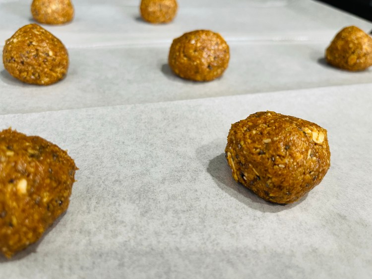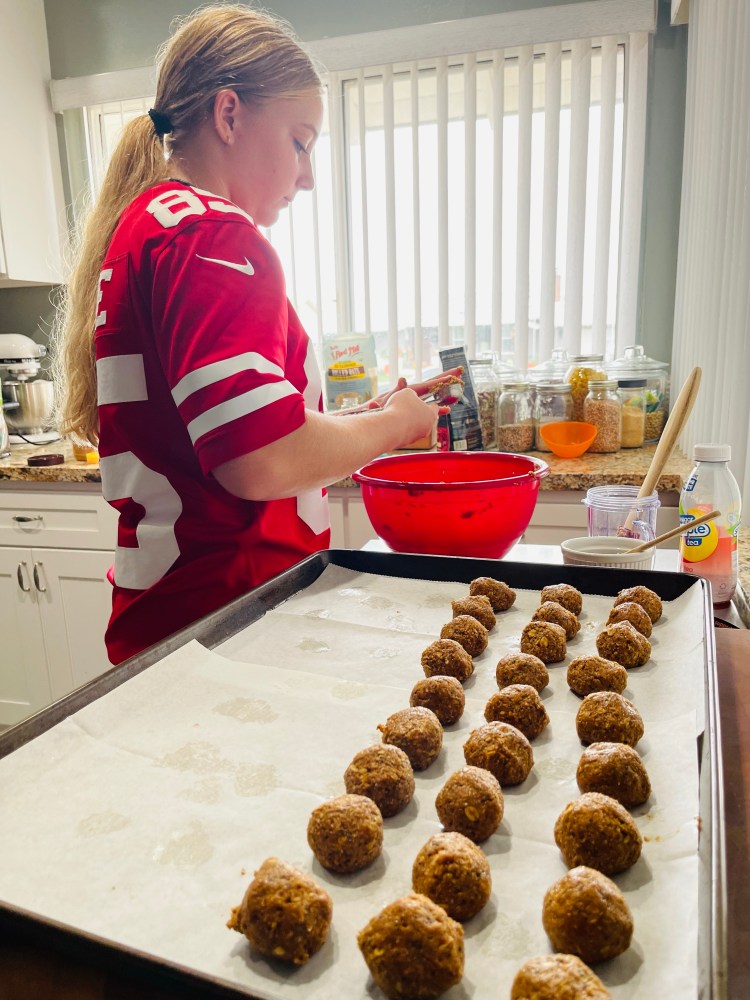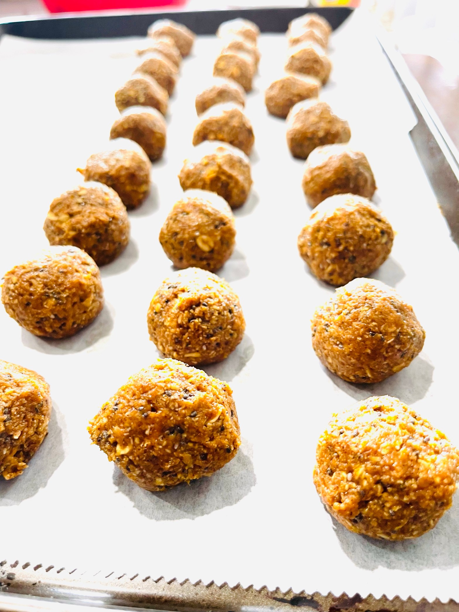 My girl Kiley loves loves loves pumpkin spice & Fall (she calls it hoodie season). So in honor of her favorite season we came up with this fun and easy snack recipe. She wanted something that she could grab on the run to school, training and baseball practice that would give her a boost of energy and be something healthy. These delicious bites are filled with ground oats, pumpkin puree, peanut butter, vanilla protein and spices, these protein bites are the perfect treat for fall!